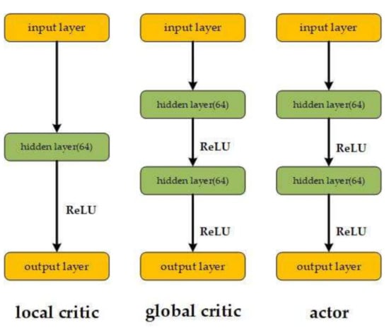 The network structure of the DE-MADDPG is shown in Figure 5. The local critic network of each agent is a three-layer fully connected neural network, including an input layer, a hidden layer, and an output layer. The input corresponds to the observation and action information of this agent. The output is a scalar that evaluates the action in the state of this agent. The hidden layer includes 64 neurons with Rectified Linear Unit (ReLU) activation function. The output layer is linear without an activation function.