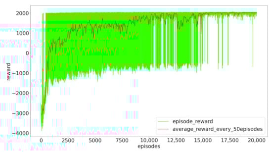 In Figure 6, we present the total reward curve of the DE-MADDPG for the training of 20,000 episodes. The green line is the reward for each episode, and the red line is the average reward for every 50 episodes. During the first 1000 episodes, the agents gradually learn the policy of moving toward the center and obtain higher intermediate rewards. The agents gradually learn the policy of building a connected network, and the reward reaches a stable value after 17,000 episodes. Note that there are very few episodes that did not achieve full connectivity within 200 steps.