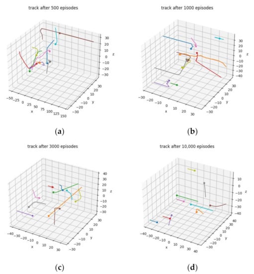 The training results after different numbers of episodes are shown intuitively in Figure 7. In the subgraphs (a–d), lines with different colors indicate the tracks of different UAVs that built the connected network, and the dot on each line indicates the position of the UAV in the cluster coordinate system after the network was connected. After 500 episodes, the tracks were very messy and redundant, and the UAVs were more likely to collide. The agents learned the policy of moving toward the center after 1000 episodes. However, the turbulent tracks show that the UAVs changed their direction of movement frequently. After 3000 episodes, the tracks were clearer, but the direction of movement of some UAVs changed too many times. After 10,000 episodes, the UAV rarely changed their direction of movement, and the change of direction was relatively smooth. We ran 100 test episodes after every 500 training episodes, and the average steps of successful testing episodes after different numbers of episodes are shown in Figure 8. This illustrates that the cluster built a connected network faster and more directly with an increasing number of training episodes.