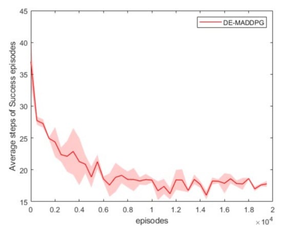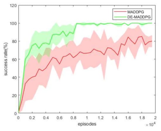 Figure 11 presents the success rate of the MADDPG and DE-MADDPG for different numbers of training episodes. We conducted 100 tests with 100 episodes of training. During the tests, the agents did not update their policy. Comparing the test results of the MADDPG and DE-MADDPG, the success rate of the DE-MADDPG was higher, indicating that the policy of the DE-MADDPG was better than that of the MADDPG.