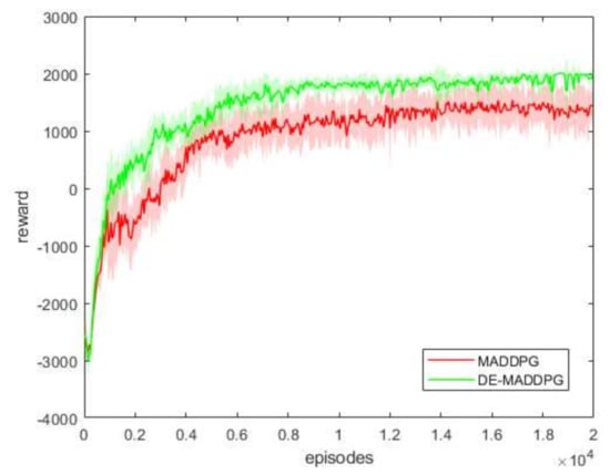 In Figure 9, we present the average reward for every 50 episodes and the standard deviation for 10 training sessions of the MADDPG and DE-MADDPG. In each training, the same random seed was used to ensure the same initial state in each training round. Throughout the training phase, the reward of the DE-MADDPG was higher than that of the MADDPG. This reason can be easily found in Figure 10, where we see that the MADDPG was not able to learn the strategy of controlling the UAV not to exceed the state space. Figure 10 also illustrates the rate of exceeding state space of the MADDPG and DE-MADDPG for different numbers of training episodes. Comparing the training results of MADDPG and DE-MADDPG, the policy that was learned by DE-MADDPG was more efficient.