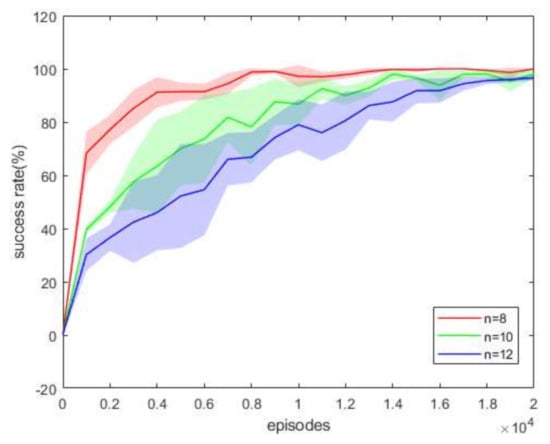Figure 12 illustrates the success rate of clusters with different numbers of UAVs after training. It is seen that by increasing the number of UAVs, the training becomes more difficult to converge. Nevertheless, after training enough episodes, all of them eventually learn excellent policies for constructing a connected network.