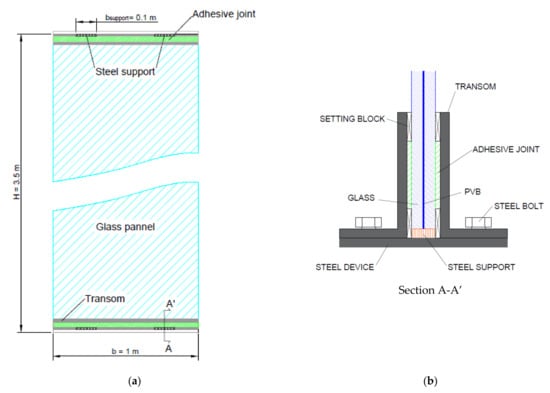 Reference geometry of two-side restrained glass panel: (a) front view and (b) detail of top/bottom linear connections (cross-section).