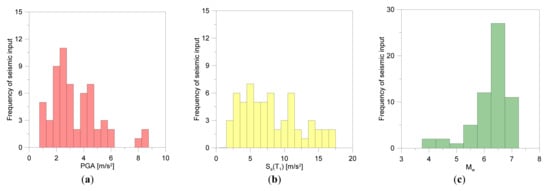 The final variation of input characteristics for seismic records is summarized in Figure 5 and Figure 6. It can be noted that the frequency histogram shapes typically recall a lognormal distribution, which generally is the most appropriate model to represent a seismic data set, as also reported in [68]. Figure 7 further confirms the global trend of examined parameters, and thus the appropriate selection of input signals [68], as it can be seen in terms of P-P plots for their lognormal distribution.