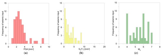 CS#2: frequency distribution of seismic input in terms of (a) PGA, (b) Sa(T1), and (c) Mw.
