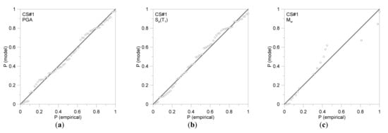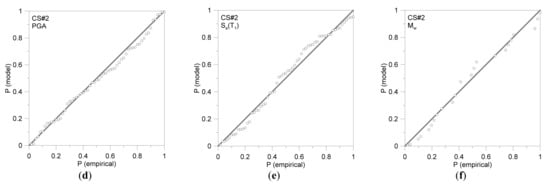 P-P plots of lognormal distributions for the input seismic parameters, as calculated for (a–c) CS#1 and (d–f) CS#2 systems in terms of PGA, Sa(T1), and Mw.