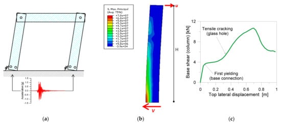 The system takes inspiration in geometrical and mechanical properties from the glass portal frame which was originally explored in [54] under in-plane seismic loads. As shown in Figure 2, the dimensions of the primary elements are 6 m for columns and 8 m for beams, respectively. The resisting cross-section of glass members has uniform size (600 × 66 mm) given by five glass layers (heat strengthened type, 12 mm in thickness) plus five interposed ionoplast foils (SG type, 1.52 mm in thickness). The beam-to-column connection is characterized by an ideal pinned connection, while the base restraint of the frame consists of a bolted steel connection (M24 diameter), whose pins pass through two holes (32 mm its diameter) made in the laminated glass column, with a relative distance of D = 500 mm (Figure 1). Finally, four mild steel brackets fix the columns to the foundation. In terms of in-plane seismic response of the case-study system, critical issues are represented by the mechanical behaviour of base connections, where glass holes can be subjected to local stress peaks [54].