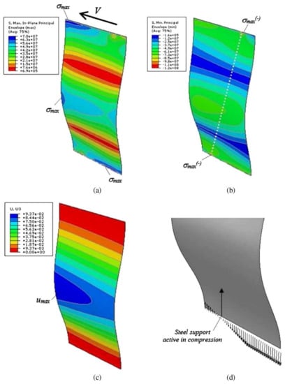 In-plane shear performance of CS#2 wall (reproduced from [56] with permission from Elsevier©, license n. 5113690452360, July 2021): (a) typical distribution of maximum tensile and (b) compressive stresses in glass (legend values in Pa), with (c) out-of-plane bending deformation (legend values in m) and (d) qualitative detail of reaction force distribution in the region of unilateral setting blocks (ABAQUS).