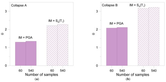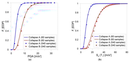 The former is based on time-history analyses in which a set of seismic inputs is scaled up until the failure of building occurs. Therefore, the output data (nc capacity parameters) are combined with nd parameters that characterize the seismic demand in demand-capacity space and provide fragility curves using the lognormal probability cumulative function. Vamvatsikos and Cornell [50] proposed to use at least 10 seismic records when performing IDA. In the second method, a set of unscaled records is arbitrarily chosen to carry out non-linear dynamic analyses. By means of Maximum Likelihood Estimation, the outcome pairs are thus fitted with a linear regression. The model error includes a contribution from uncertainties (i.e., record-to-record variability, model-type uncertainty or method-related uncertainty [51]) as well as from fitted model itself, whereby a constant standard deviation is considered.