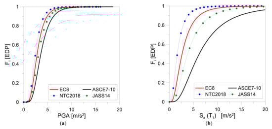 Finally, as shown in Figure 16, the performance indicators provided by NTC2018 standard result in a most severe fragility function for the examined system, while the ASCE7-10 limit condition can be associated with less conservative predictions. Such an outcome is particularly emphasized for fragility curves in terms of Sa(T1). For fragility estimates in terms of PGA, a less pronounced scatter can be noticed from Figure 16a. The probability of collapse for seismic zone 1, for example, is in the order of ≈78% based on NTC2018, but up to ≈45% for ASCE7-10 limit parameters.