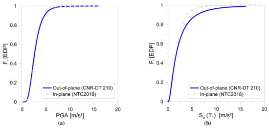 To this aim, Figure 17 reports the in-plane fragility function based on NTC2018, for graphical match with the out-of-plane indicators. Quantitative comparisons are further summarized in Table 7. The selected data, as shown, prove that the in-plane lateral displacement represents, both for PGA and Sa(T1), the most severe condition in case of seismic analysis for facade components. Such an outcome confirms the accuracy of simplified design procedures as discussed in Section 4. At the same time, the comparative analysis gives evidence of rather close correlation for in-plane and out-of-plane fragility functions as in Figure 17a, thus suggesting a further dedicated analysis of performance indicators for generalized proposals.