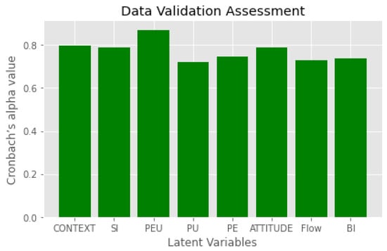 Next, to evaluate and validate the originality of data, the first method was implemented to conduct data standardization. In this process, we measured the average (Avg) and standard deviation (SD) of all latent variables result and the average for each item; Table 3 displays the results in that the average of all factors is above 5; therefore, these assumptive constructs are standard. In addition to the analysis, the Cronbach’s alpha value was demonstrated to determine the internal consistency and convergent validity of the latent variables mentioned below in Table 3, also represented graphically in Figure 4.