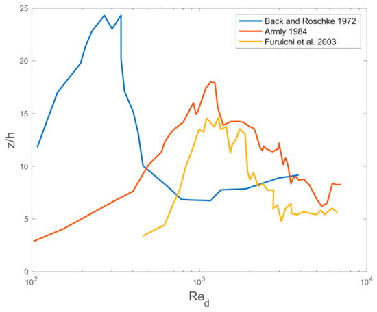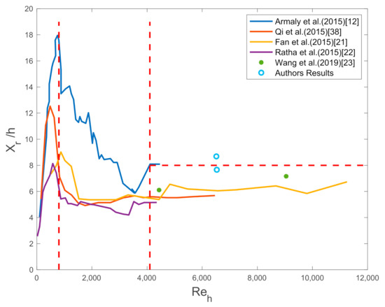 Nie and Armaly [19] presented a scheme for a specific step–wall ratio that estimates the location where the shear stress is zero as a function of different Reynolds numbers. Moreover, Furuichi et al. [20] showed a comparison among the results of two other studies (see Figure 1).