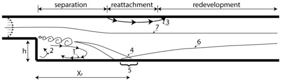 Simplified representation of physical phenomena in a two-dimensional BFS flow: 1 = recirculation bubble and coherent structure in the shear layer; 2 = second vortex in the step corner region; 3 = secondary vortex on the upper wall; 4 = reattachment point; 5 = reattachment zone; 6 = redeveloping boundary layer; 7 = original turbulent boundary layer.