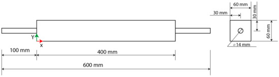In contrast to Figure 2 a symmetrical geometry was used in the current work. The particular design is depicted in Figure 3. The water inlet and outlet were 14 mm diameter pipes. Nevertheless, the test area was a rectangular geometry of 60 × 60 × 400 mm. The simulation setup was designed as three-dimensional to achieve a better resolution [25].