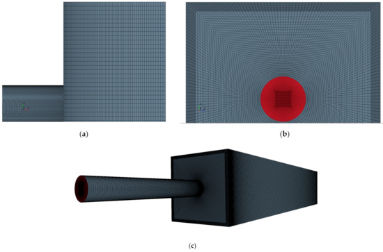 The 11,040,000 cell mesh from different perspectives: (a) XY plane view, (b) ZY plane view and (c) perspective view.