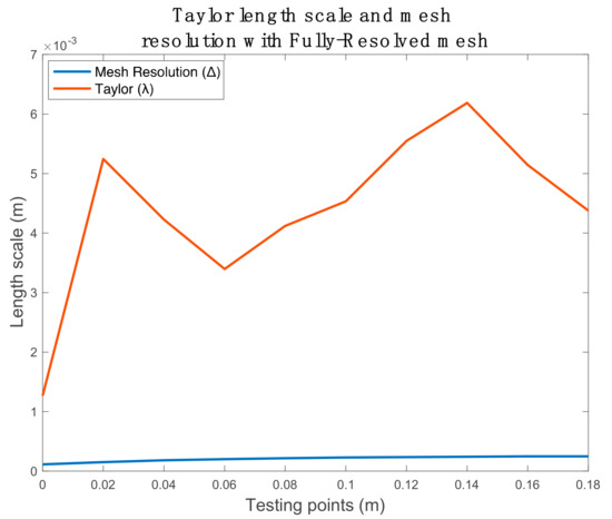 Moreover, the LES WALE model required another evaluation technique, the Taylor length scale . This value had to be examined to verify sufficient mesh resolution, and the resolution had to be at least on the order of to fully resolve the Taylor length scale. After performing the experiment, the mesh designed for the current work was approved for developing a LES simulation. Hence, the simulation results were considered reliable.