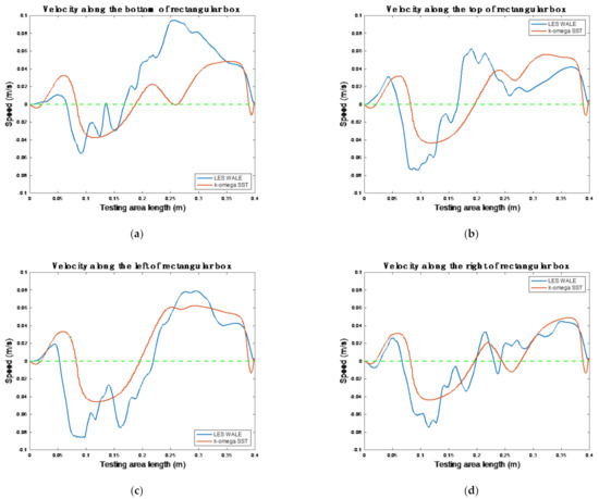 In Figure 9, the velocity variations in different planes (top, bottom, left, and right) are represented. In all illustrations, there is a green line that differentiates the negative values from the positives ones. As a general conclusion, the velocity predicted by the LES WALE model exhibited more variation. Therefore, a more thorough analysis of the velocity was required.