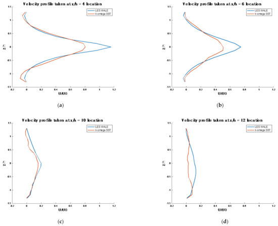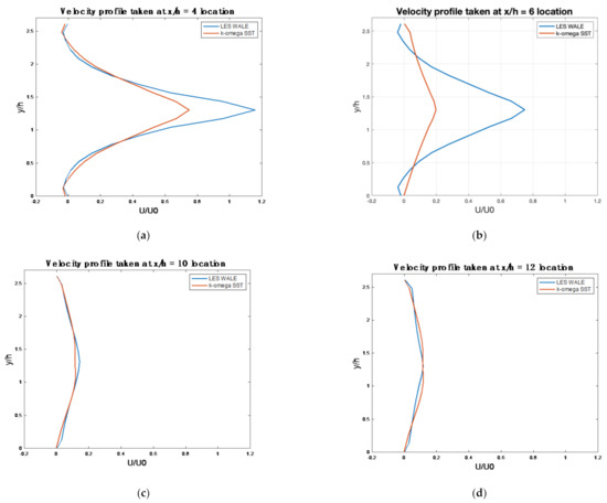 The x/h = 4 position was the only one where the difference was larger (see Figure 10a). This position was close to the expansion zone, where the turbulence was highest. The maximum value of difference was approximately U/U0 = 0.402 at the height y/h = 1.3. Therefore, the LES WALE processed a much higher turbulence than the k-omega SST did.