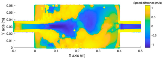 At this point in the simulation, the mean velocity of both models was compared by subtracting the average speed of the LES WALE cell from the mean velocity of the k-omega SST cell to obtain the relative variance between them, as Figure 12 illustrates.