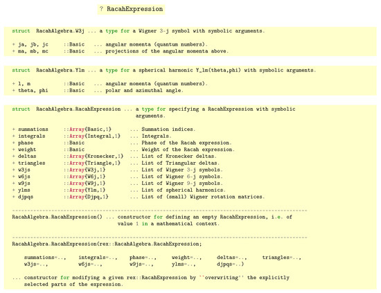 For example, Figure 2 displays the data structures W3j for a Wigner 3-j symbol with symbolic arguments , Ylm for a spherical harmonic as well as a RacahExpression as it is formally shown in expression (1). A few further data structures of the RacahAlgebra module (within Jac) are shown and briefly explained in Table 1. These data types facilitate the user to map the internal complexity of Racah’s algebra upon the evaluations to be done. The internal definition of the data structures can be readily obtained at the Julia Repl [39] by typing, for instance,