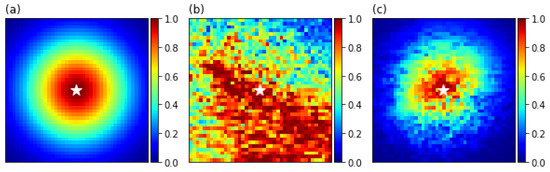 (a) The distance-weighted correlation, (b) the similarity-weighted correlation ( W: W; S: S) and (c) local weighting. The five-pointed star indicates the point of correlation.