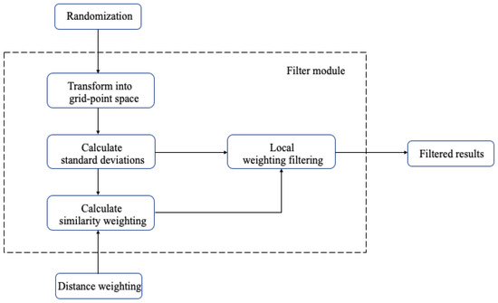 The application of the local weighting filtering on the operational VAR system is considered, and the implementation flowchart is shown in Figure 2. The local weighting filtering can run directly in the grid-point space to remove the sampling noise without transforming the filtered results between the grid-point and spectral space and is easier to implement in the statistical post-processing of the VAR system. Another striking feature is that the distance-weighted correlation can be calculated offline because the sample realizations are fixed in the grid-point space; therefore, the filter module has a higher parallel efficiency. Once the filtering domain is determined, the threshold range of filtering realizations is adjusted adaptively by the similarity-weighted correlation, and the local weighting becomes flow-dependent with the statistical properties of samples.