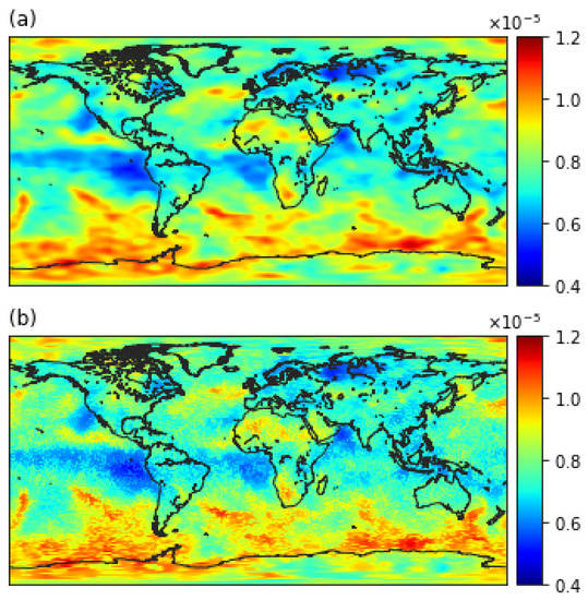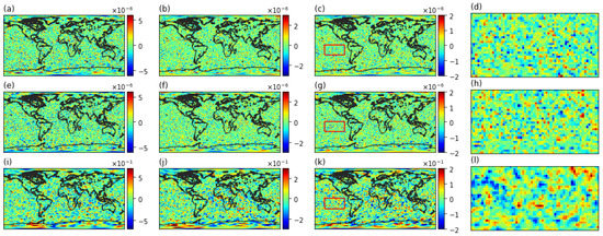 It can be found that the sampling noise is distributed uniformly in the standard deviation estimates, which is presented to be white noise. The noise distribution in high-latitude areas is larger than that in the low-latitude area, which is related to the projection method of the Earth, in which the high-latitude areas are enlarged when mapped to a plane. The structure distribution of sampling noise is similar with the different model variables in Figure 3a–l, and this feature is more easily observed in the enlarged maps (Figure 3d,h,l). This phenomenon shows that the sampling noise caused by the randomization technique has a similar symmetry form regardless of the model variables. Thus, a unified filtering method can be used to filter the sampling noise in the operational model.