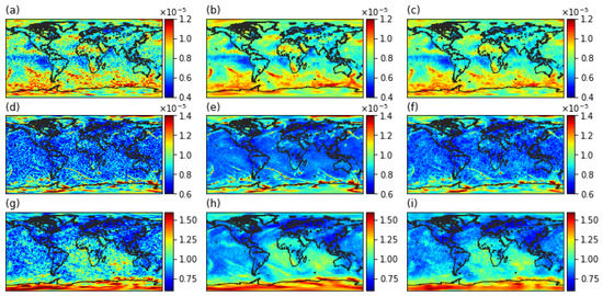 (a) Raw estimates of vorticity standard deviations near surface (1000 hPa) from 50 samples, (b) reference estimates and (c) the corresponding filtered results of raw estimates. (d,e) and (f) ((g,h) and (i)) are the raw estimates of divergence (zonal wind) standard deviations from 50 samples, reference estimates and the corresponding filtered results. Unit: s.