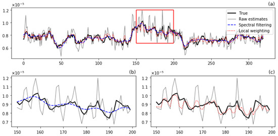 Figure 8 shows the proposed filtering and spectral filtering with correlated and heterogeneous noise in a 1D analytical framework. It may also be noticed that the results of spectral filtering (dashed line) are smoother and the small-scale signals are also greatly weakened at the same time. The local weighting filtering becomes more heterogeneous, and localized filtering in the small-scale area helps to preserve the local structure of the signal to a greater extent than the spectral filtering, as shown in Figure 8c.