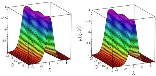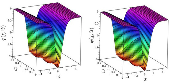 In Figure 1, the actual and HPTM solutions of is calculated at . In Figure 2, the 3D graphs for for different fractional-order shows that the HPTM approximated solutions derived are in a strong agreement with the actual and the approximate solution. Similarly Figure 3, the actual and HPTM solutions of is calculated at . In Figure 4, the for different fractional-order shows that the HPTM approximated solutions derived are in a strong agreement with the actual and the approximate solution. This comparison shows that the HPTM and the actual solutions are very close. As a result, the HPTM is a dependable new study that requires less computation of computations, is adaptable, and simple to use.