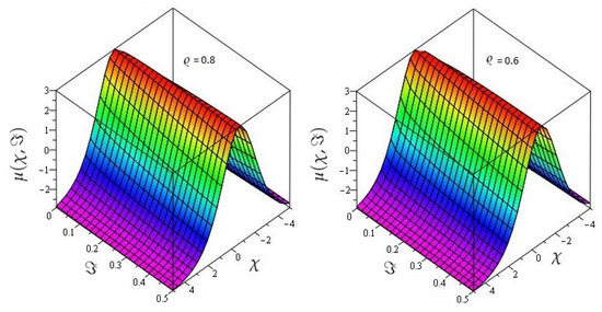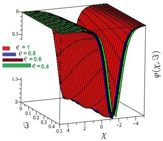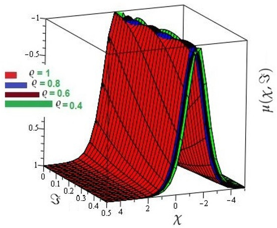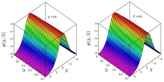 In Figure 5 the actual and HPTM solutions of is calculated at . In Figure 6, the 3D graphs for for different fractional-order shows that the HPTM approximated solutions derived are in a strong agreement with the actual and the approximate solution. Similarly Figure 7, the actual and HPTM solutions of is calculated at . In Figure 8, the for different fractional-order shows that the HPTM approximated solutions derived are in a strong agreement with the actual and the approximate solution. This comparison shows that the HPTM and the actual solutions are very close. As a result, the HPTM is a dependable new study that requires less computation of computations, is adaptable, and simple to use.