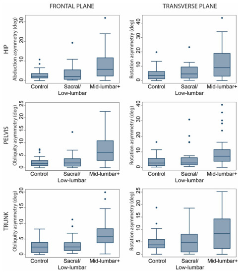Asymmetry of hip, pelvis, and trunk motion in the frontal and transverse planes was compared among the mid-lumbar+, sacral/low-lumbar, and control groups using analysis of variance (ANOVA). The ROM variables were similarly compared among the same groups using ANOVA. In the mid-lumbar+ patients, the effect of assistive device use (none, crutches, or walker) on asymmetry was also examined using ANOVA. In all cases, Bonferroni post hoc tests were used following ANOVA. All statistical analysis was performed using Stata version 14.2 (StataCorp LLC, College Station, TX, USA) with a significance level of 0.05.