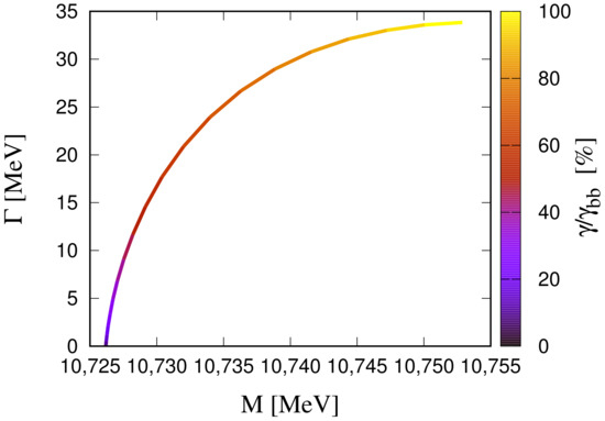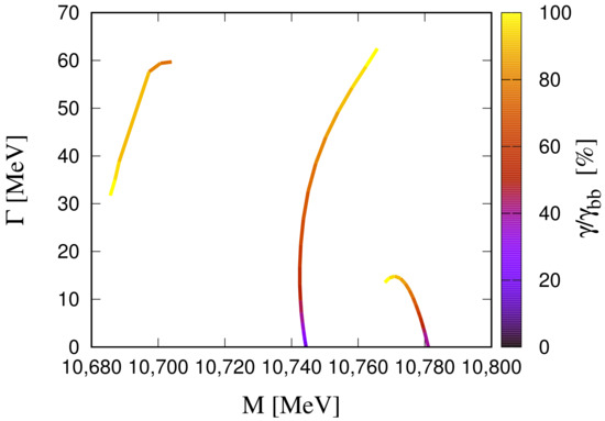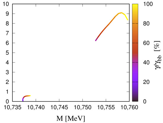 Only two new states appear, with quantum numbers . The first one is basically a molecule () at an energy of 10,599 MeV/, whereas the second correspond to a molecule at 10,738 MeV/. Further experimental searches, possibly looking to the channel, would confirm the existence of the molecule.