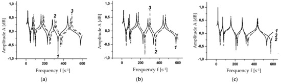 Sandwich frequency response for different values of magnetic field strength (a–c) and for different types of material: 1, 2 and 3. B = 0 (a), B = 250 G (b), B = 800 G (c) and for different types of material: 1, 2 and 3.