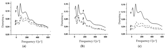 Damping in sandwich frequency for different values of magnetic field strength: B = 0 (a), B = 250 G (b), B = 800 G (c) and for different types of material: 1, 2 and 3.