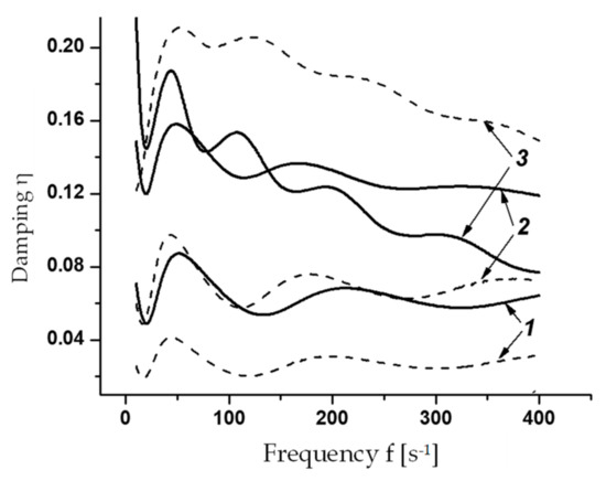 Let us now consider the oscillations of asymmetric five-layer freely supported centrally loaded beam with the following values of 0.3 m layer thicknesses: h1 = 0.001 m for a central rigid layer, h2 = 0.001 m for two inner symmetrically located MR layers, and h3 = 0.005 m for two outer layers of covers. A composite with the following mechanical properties is considered as a material of rigid layers: Cxx = 5400 MPa, Czz = 750 MPa, G = 200 MPa, Cxx = 375 MPa, ρA = 2400 kg/m3 and as a material of MR layers—MRF 132DG. Figure 4 shows the dynamic properties (damping) of a five-layer beam in comparison with a similar three-layer beam, the thickness of the inner MR layer of which was equal to 0.002 m, and the thickness of its composite covers were equal to −0.001 m. Here in Figure 4, solid lines correspond to a three-layer beam, and dotted lines correspond to a five-layer beam.