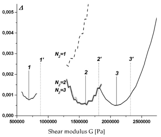 The identification of the shear modulus for the material of the second type (see relations (10)) according to the results of dynamic tests is implemented by minimizing the error function in the form of the total square deviation between the calculated and experimentally measured [22,23,24,25,26] Eigen frequency values: