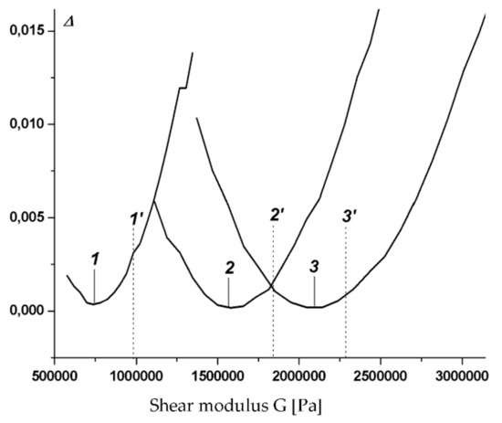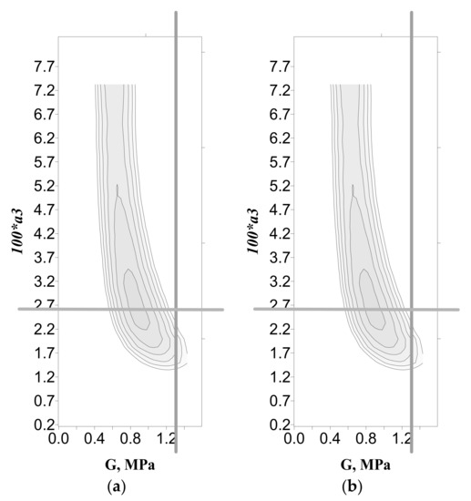 Figure 7 shows the deviation maps of the function (10) for the frequency-dependent shear modulus (9), where the point of intersection of the straight lines corresponds to their fixed values in (9).