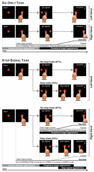 All trials started with the presentation of a red circle at the center of the monitor. Subjects were instructed to touch and hold the central stimulus with the index finger for a period of time varying from 500 to 800 ms. Subsequently, in the go-only task (Figure 2, Go-Only Task) and the no-stop trials of the SST (Figure 2, Stop-Signal Task), the central stimulus was removed, and, simultaneously, a target appeared (go-signal) on the horizontal plane on the same side of the responding arm at 18.6 degrees (13.5 cm) either to the right (right go-only/no-stop trial) or to the left (left go-only/no-stop trial) of the central stimulus. In these instances, participants had to perform a reaching movement toward the peripheral target, touching and holding it for 300 to 400 ms (in steps of 50 ms) until they heard acoustic feedback signaling a successful trial. By contrast, in the stop trials (34% of all the trials; Figure 2, Stop-Signal Task), after the presentation of the go-signal, the central stimulus reappeared (stop-signal) at a variable delay (stop-signal delay, SSD), and participants were instructed to inhibit their movement towards the peripheral target. The length of the SSD was varied via a staircase algorithm [58] that aimed to allow participants to cancel their responses about 50% of the times. The initial value of the SSD was set to 119.7 ms (9 refresh rates). Then the staircase procedure increased the SSD by 39.9 ms (3 refresh rates) when participants correctly canceled the response, making the stopping more difficult. By contrast, the SSD length was decreased by the same amount of time when the participants did not withhold the movement. Every time the participants successfully withheld the response, keeping the index finger still for 300–400 ms, the trial was successful and signaled by auditory feedback.