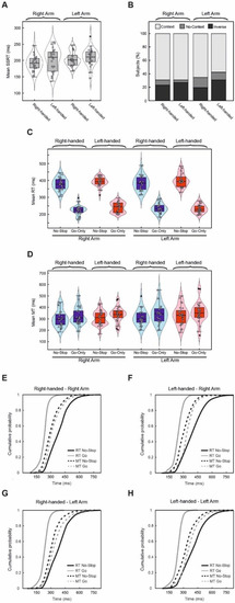 (A) Mean stop-signal reaction times (SSRTs) as a measure of reactive inhibitory control for right- and left-handed subjects using the right and left arm. (B) Percentage of subjects showing context, no-context, and inverse context effect as a measure of proactive inhibition for each handedness group and arm used. (C) Mean reaction times (RTs) of the no-stop trials during the stop-signal task (no-stop) and the go-only task (go-only) in each condition. (D) Mean movement times (MTs) for each condition (as in C). Milliseconds (ms). The violin plots depict kernel probability density, i.e., the width of the areas represents the relative frequency of the data. Box plots are shown inside the violin plots. The lower box’s boundary indicates the first quartile, the median is marked with a black line, and the upper box’s boundary indicates the third quartile. Whiskers indicate values 1.5 times the interquartile range below the first quartile and above the third quartile. Single data points are pictured as jittered white dots. Outliers are represented as full black dots. (E) Cumulative distributions of RTs (solid lines) and MTs (dotted lines) of right-handed subjects (n = 26) using the right arm for go-only trials (gray) and no-stop trials (black). These cumulative distributions were obtained by collapsing together the cumulative distributions of RTs and MTs of no-stop and go-only trials of single subjects. Two-sample Kolmogorov–Smirnov test: (i) RTs, D = 0.71, p < 0.0001; (ii) MTs, D = 0.12, p < 0.0001. (F) Cumulative distributions of RTs and MTs of left-handers subjects using the right arm (n = 26) for go-only and no-stop trials. Two-sample Kolmogorov–Smirnov test: (i) RTs, D = 0.65, p < 0.0001; (ii) MTs, D = 0.24, p < 0.0001. (G) Same Right-handers subjects as in C, but using the left arm. Two-sample Kolmogorov–Smirnov test: (i) RTs, D = 0.67, p < 0.0001; (ii) MTs, D = 0.13, p < 0.0001. (H) Same left-handers subjects as in D but using the left arm. Two-sample Kolmogorov–Smirnov test: (i) RTs, D = 0.69, p < 0.0001; (ii) MTs, D = 0.15, p < 0.0001.