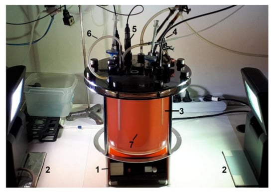 The cylindrical 4.0 L photobioreactor utilized for culturing Rhodopseudomonas sp. Magnetic stirrer (1); lamps (2); temperature probe (3); heating/cold finger (4); pH probe (5); sample port (6); 4-paddle rotor (7).