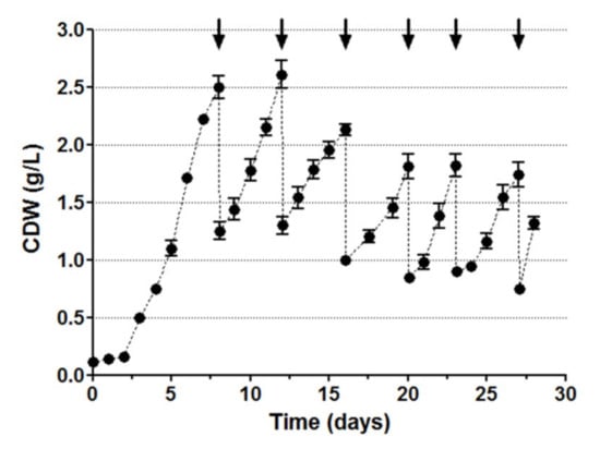 Changes in CDW over time during Rhodopseudomonas sp. growth in the 4.0 L photobioreactor (arrows indicate culture dilution times).