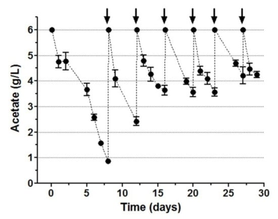 Changes in acetate concentration over time during Rhodopseudomonas sp. growth (arrows indicate culture dilution times).