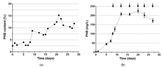 (a) PHB content (% of CDW) inthe Rhodopseudomonas cells; (b) intracellular PHB concentration (mg/L) versus time (arrows indicate culture dilution times).