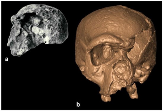 The complex pattern of deformation that affected Steinheim, as well as its incomplete status and the presence of extensive incrustations, made it difficult to discern whether its peculiar morphology represents the original shape of the individual, or it is the product of taphonomic deformation [36,37]. This uncertainty contributed to a longstanding debate concerning the Steinheim phylogenetic position [36,38,39,40]. The cranium is characterised by a peculiar mixture of archaic and derived traits, which originated different proposals about its position within or close to the Neanderthal lineage—as representing a ‘pre-Neanderthal stage’ along the so-called process of accretion—or even as a specimen somehow related to the origin of Homo sapiens [41,42,43,44,45]. However, not only most of the left side of the facial skeleton in Steinheim is missing, but also the cranium presents a peculiar plastic deformation, further complicating the recognition of its features. For example, the highly diagnostic infraorbital plate and orbitomaxillary region are preserved only on the left side. This part of Steinheim’s face shows an angled transverse profile, which was interpreted in the past as ‘anticipating’ the modern human morphology to some degree [30,43], but has been conversely interpreted as the result of the retention of archaic facial morphology, also observed in some Western European earlier taxa (i.e., Homo antecessor) [46,47,48]. The relatively low and long neurocranium of Steinheim, possessing a rather vertical occipital plane, also shows a slightly angled coronal profile, or a ‘roofed’ appearance [36], with the maximum cranial width occurring in the lower portion [35].