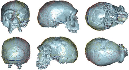 - Gunz, P.; Mitteroecker, P.; Neubauer, S.; Weber, G.W.; Bookstein, F.L. Principles for the virtual reconstruction of hominin crania. J. Hum. Evol. 2009, 57, 48–62. [Google Scholar] [CrossRef]