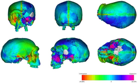 The local displacement between the starting and the retrodeformed meshes (Figure 5) indicates the areas of maximum expansion, which is apparent on almost the entire left side of the skull, with the highest values recorded in the preserved portions of the left maxilla, left parietal, and left orbit. Conversely, the right side of the face is affected almost entirely by contraction, with the highest values recorded at the level of the anterior portion of the maxilla and nasofrontal suture. However, the inferior portion of the right maxilla is expanded in the retrodeformed mesh. A somewhat balanced pattern of deformation occurs on the basicranium. The areas of maximum contraction on the right side are associated with areas of maximum expansion on the opposite side. Similarly, the moderate expansion recorded on the right side of the occipital squama corresponds to an almost symmetrical contraction of the left side. Lastly, along the midsagittal plane an area of contraction appears evident.