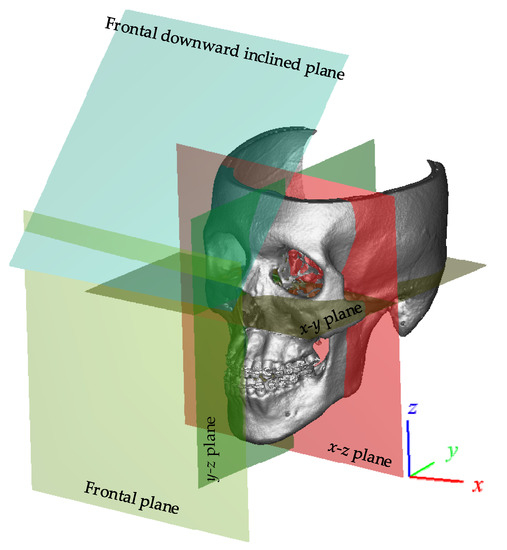 Orthognathic surgery is used to reposition the basal bone in the framework of maxilla-mandibular deformities [1], providing aesthetic and functional results [2]. Surgical planning prior to orthognathic surgery may include discussions on occlusal balancing, facial symmetry, and harmony [3]. Results may vary (depending on the surgeon). Choosing the best plan that is most suitable for a patient strongly dependents on the person who executing the planning. Facial symmetry is correlated with attractiveness in humans [4,5,6,7]. Contrarily, facial asymmetry is commonly observed in either mandible or maxilla deformities, resulting in mandibular skew. Mandibular contour is a useful way to evaluate facial symmetry before and after surgery [8]. Quantifying one’s facial asymmetry status may not be comprehensive when only considering a two-dimensional (2D) analysis, since asymmetry expression can vary tremendously in a three-dimensional (3D) analysis. In fact, a complete evaluation of facial asymmetry requires three-dimensional involvement, and a more comprehensive method than comparing contours to quantitate an asymmetrical degree. In traditional two-dimensional “paper” planning for orthognathic surgery, based on landmarks, the surgeon evaluates the asymmetry status affecting the midface and mandible, with a midface line drawn on the anterior–posterior cephalogram [9]. Owing to the progress of medical image processing techniques, we used the mid-plane formed by the landmarks on the 3D skeleton model reconstructed from computer tomography to assess the facial asymmetry [10,11,12,13,14,15]. However, for patients with serious facial deformities, the bilateral landmarks were congenially asymmetric; it was difficult to find the true and unique symmetry plane for both midface and mandible.