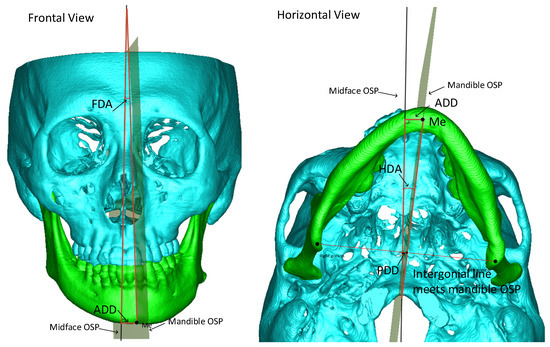 - Anterior deviation distance (ADD): the distance between the chin point to the midface OSP; a positive value indicates the point on the left side of midface OSP, and negative otherwise. The chin point is where the mandibular OSP meets the lower border of the chin.